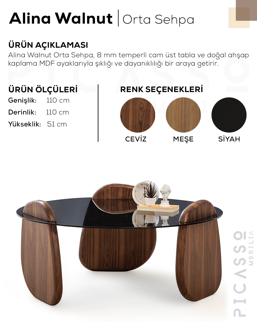 Alina Walnut Orta Sehpa, ceviz kaplama yüzeyiyle doğal ve sıcak bir görünüm sunar.